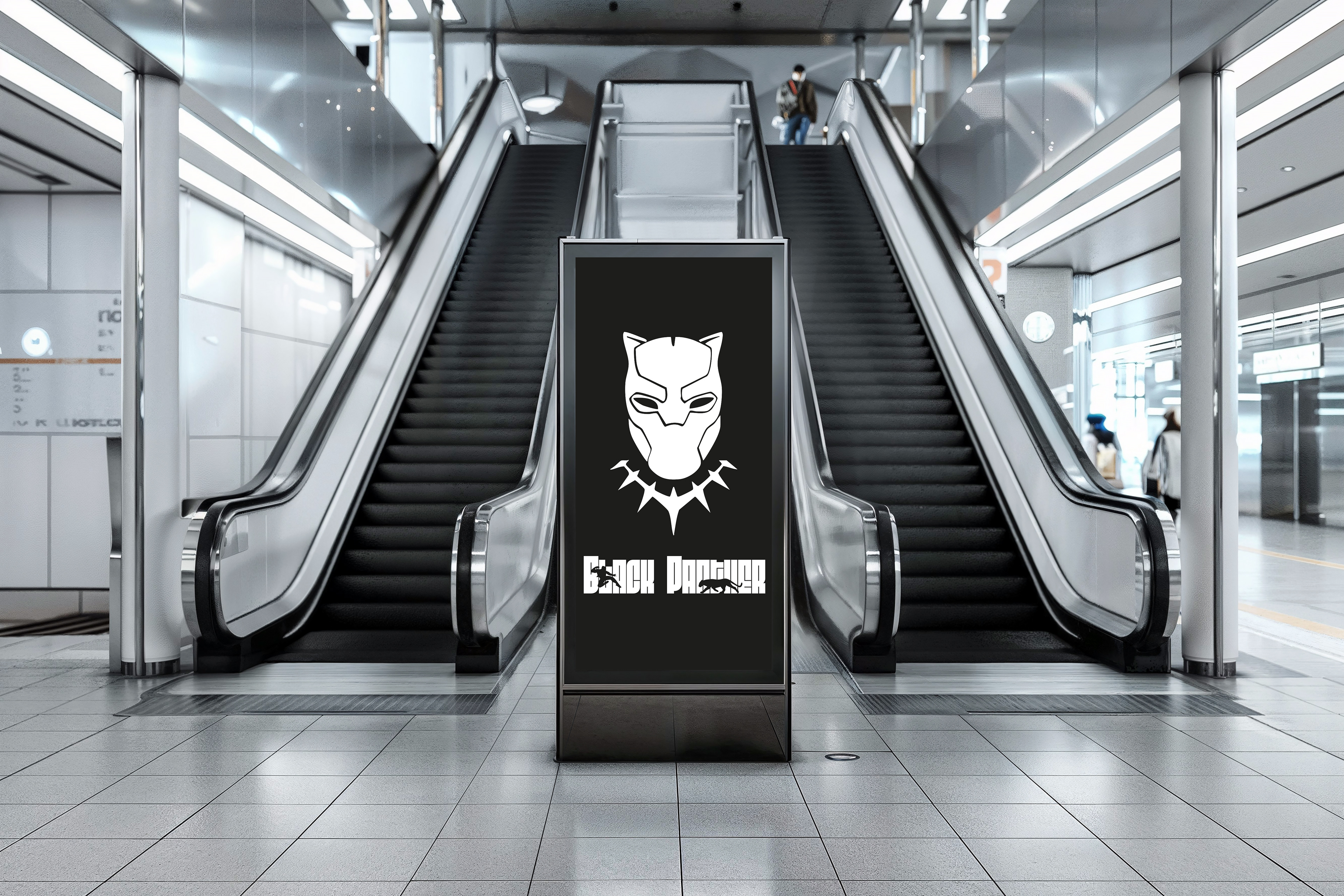 Ici, le sujet donné était l'identité visuelle d'un film qu'on aimait bien, en partant d'un visuel en moodboard du film, afin de comprendre l'ambiance, et en finissant par la création d'une affiche, placardé (grâce aux mockups) un peu partout, comme si le film passé dans les cinémas. Pour ça, j'ai choisi "Black Panther".